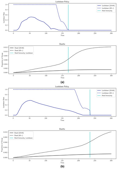 Robustness results for (inter-group interaction level). , , , , , , , , , (a) , lockdown: 233 d, output loss = 8.118%, total deaths = 0.2753%; (b) , lockdown: 194 d, output loss = 7.0292%, total deaths = 0.3657%.