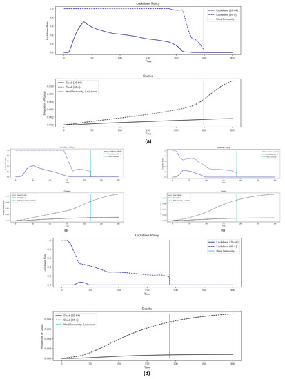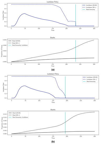If the population is less obedient and disregards lockdown measures, for example if decreases from 0.75 to 0.6, we see that the lockdown is shorter because herd immunity is reached sooner. This decreases output loss, but leads to more deaths. If the population is more obedient, however, for example if , the effect of a given level of lockdown is larger with respect to the same level of output loss, so lockdowns are less intense, but last longer. The arrival of herd immunity is slower, leading to higher output loss, but the strategy has the benefit of lower mortality. This is because the same level of output is lost for a given lockdown rate, regardless of , and so, higher obedience levels result in a lockdown being more “worth” the output loss; therefore, the algorithm allows a slightly higher output loss in order to achieve much lower mortality rates. This implies that if a lockdown is enacted, for maximum efficiency, it should be correctly incentivized in order to achieve high obedience.