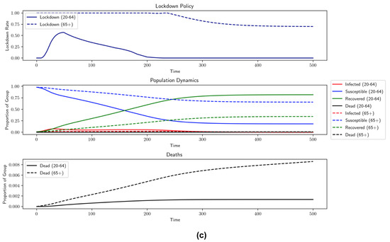 Robustness results for (arrival of herd immunity). , , , , , , , , , . (a) Herd immunity = 65%, output loss: 7.8084%, total deaths: 0.2948%; (b) herd immunity = 70%, output loss = 7.8496%, total deaths = 0.2724%; (c) herd immunity = 75%, output loss: 7.967%, total deaths: 0.2732%.