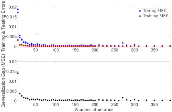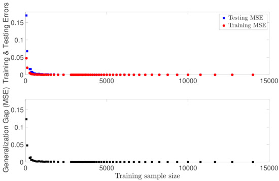 where the first and second terms in parentheses represent approximation error and estimation error, respectively. Specifically, represents the error evaluated using the hypothesis over the underlying data distribution D. represents the optimal hypothesis (maybe outside of the finite hypothesis class ) for the data distribution D. is the optimal hypothesis within that minimizes the loss functions over the distribution D. It can be seen that the approximation error depends on how close the hypothesis class is to the optimal hypothesis . In other words, a larger hypothesis class generally leads to a lower approximation error since it is more likely that the optimal hypothesis is included in . The estimation error depends on both the hypothesis class size and training data, and characterizes how good the selected hypothesis associated with the training dataset S is with respect to the best hypothesis within hypothesis class . As a result, a larger hypothesis class may in turn lead to a higher estimation error since it is more difficult to find the optimal hypothesis within over the distribution D. From the error decomposition of Equation (17), we demonstrate the dependencies of generalization error on the training dataset size and the complexity of hypothesis class. In the next section, we will take advantage of Rademacher complexity technique to derive a generalization error bound accounting for its dependencies on the above factors in a quantitative aspect. The results will also provide a guide for the design of neural network structures and the collection of training data in order to achieve a desired generalization performance for a specific modeling task.