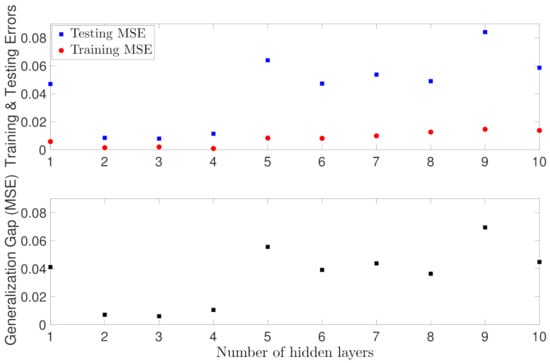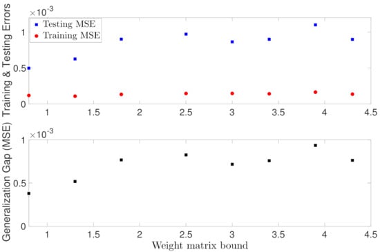 We consider the mean squared error (MSE) as loss function in this work. It is readily shown that the MSE loss function is not Lipschitz continuous for all . However, since we consider a finite hypothesis class that satisfies Assumptions 1–4, we can show that the RNN output is bounded. This is consistent with the fact that the nonlinear system of Equation (1) is operated in the stability region , and therefore, the RNN outputs are bounded within a compact set.
