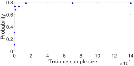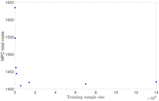 Figure 9 shows the probability of closed-loop stability calculated following the above policies. It is seen that with more training data, the probability of the CSTR of Equation (74) being stabilized at its steady-state becomes higher, and the probability settles at around 0.78 for a sufficiently large dataset. The probability results in Figure 9 for RNN models in Case study 1 are consistent with its generalization performance plot in Figure 2, which shows that the generalization error decreases with more data used for training. In addition to the calculation of the probability for closed-loop stability, we also use the MPC cost function of Equation (68) as an indicator for comparing control performance in terms of the convergence speed and energy consumption. Specifically, the MPC cost function of Equation (68) in this example is designed in the following form: