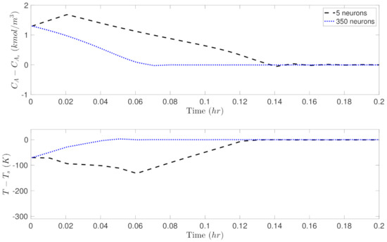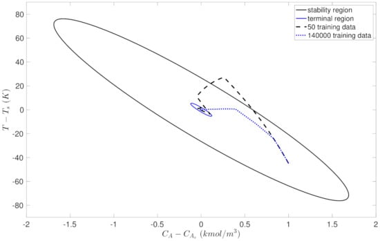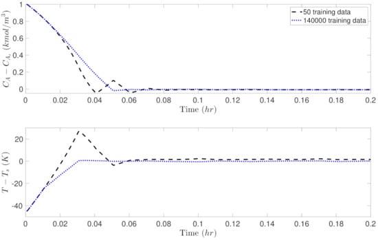 where and are chosen such that the two states and the two inputs are in the same order of magnitude, respectively. Also, in this example, we put more penalty on the states x to allow the states to be driven to the steady-state more quickly. For each RNN model, we calculate the total costs over the entire simulation period hr, and sum up the cost values for all the trajectories initiated from 48 different initial conditions. Figure 10 shows the MPC total costs for the RNN models trained with different data sample sizes. It is demonstrated that with less training data, the MPC achieves a higher total cost, representing a slower convergence to the steady-state and/or a higher energy consumption. With a large number of training data (i.e., ), the MPC total costs remain at around 1420, and no significant improvement is noticed with more data added in training. Additionally, Figure 11 and Figure 12 show the closed-loop state trajectory and state profiles for one of the initial condition out of 48 initial conditions. As shown in Figure 11, the state trajectory using the RNN model trained with 50 training data (dashed line) leaves the stability region due to poor predictions in solving the MPC optimization problem. On the contrary, the state trajectory using the RNN model with 14,000 training data (solid line) moves towards the steady-state smoothly and is ultimately bounded in the terminal set . This can also be seen in the closed-loop state profiles of Figure 12, where the temperature under 50 training data shows a sharp increase at 0.03 hr.