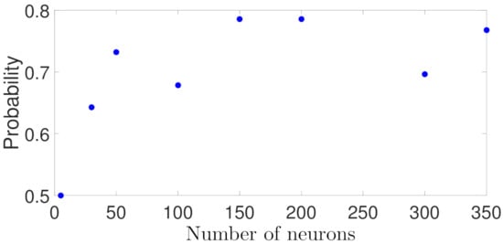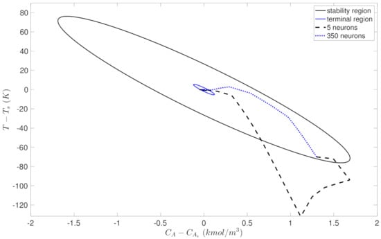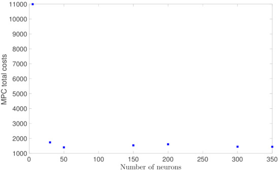 Similar to the analysis for Case study 1, Figure 13, Figure 14, Figure 15 and Figure 16 show the probability of closed-loop stability, MPC total costs, as well as the state-space trajectory and state profiles for one of the initial condition for the RNN models in Case study 2. In Figure 13, it is shown that the probability starts from 0.5, and settles at around 0.7 for wider RNN models (i.e., more neurons). Figure 14 shows the MPC total costs for different models, from which it is demonstrated that the first model with only 5 neurons has a extremely high value, and all the other models achieve a total cost around 1500. Figure 13 and Figure 14 demonstrate that all the RNN models except the first one achieve desired closed-loop performance in terms of high probability of closed-loop stability and low total costs. This is due to the low generalization error (around 0.005) for nearly all the models in Figure 3. Figure 15 shows the comparison of the closed-loop state trajectories under the two RNN models using 5 and 350 neurons, respectively, from which it is demonstrated that the model with 5 neurons (dashed line) drives the state out of the stability region, while the one with 350 neurons successfully stabilizes the system in the terminal set. The corresponding state profiles (i.e., and ) can be found in Figure 16.