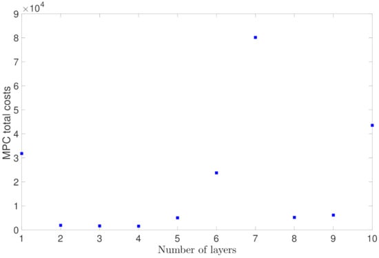 To simplify the discussion for the remaining case studies, we will show the probability plot and MPC total cost plot only. Figure 17 shows the probability of closed-loop stability with respect to different RNN depths. It is demonstrated that the probability starts close to zero for one layer, increases up to 0.7 for four layers, and then decreases to almost zero for six layer and after. This trend follows exactly the generalization error plot in Figure 4, which shows the model with two, three and four layers achieve the lowest generalization error, and the models with more than five layers show worse generalization performance due to overfitting. Comparing to the closed-loop results for the RNNs with various widths in Figure 13 and Figure 14, it is not surprising to see that the overall probability of closed-loop stability in this case study is worse because the open-loop generalization performance for the RNNs developed with different depths (Figure 4) is worse than that for the RNNs developed with different widths (Figure 3). Additionally, in Figure 18, we observe a similar pattern showing that the MPC total costs have the lowest values for two, three and four layers, and rise up for more layers.