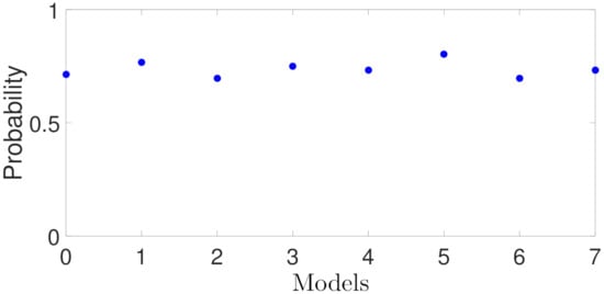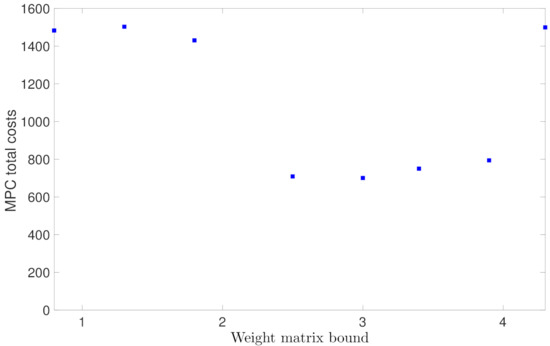Figure 19 shows the probability of closed-loop stability for the RNN models with different weight matrix bounds in Case study 4. It is shown that all the RNN models achieve a probability up to 0.7. The high probability of closed-loop stability is expected since in the open-loop generalization error plot in Figure 7, it is shown that all the models with different weight matrix bounds have a sufficiently small generalization error around . As a result, the MPC total costs in Figure 20 are stable around 1000 for all models.
