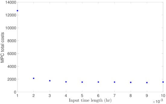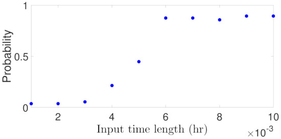 Lastly, Figure 21 and Figure 22 show the closed-loop simulation results for Case study 5. As shown in Figure 21, the probability of closed-loop stability increases as the RNN input time length increases, and settles at around 0.9 for input time length greater than hr. This seems inconsistent with the generalization performance of Figure 8 which shows the generalization error increases for longer input sequences at first glance. However, as we have discussed earlier, a low open-loop generalization error for short input sequences does not guarantee a desired closed-loop performance under MPC. Specifically, with shorter input sequences, the RNN prediction needs to be executed successively in each MPC iteration to predict all the future states within the prediction horizon. For example, in order to predict one sampling time hr, the first RNN model with input length in Figure 21 needs to run 10 times, and each time uses the previous predicted state as the initial state. The error accumulates during the calculation, which ultimately leads to poorer closed-loop performance. Therefore, for RNN models used in MPC, the input time length should be chosen carefully accounting for the system sampling time and MPC prediction horizon. Additionally, Figure 22 shows the MPC total costs with respect to different RNN input time lengths. It is seen that the first RNN model achieves the worst cost value, and all the other models have similar cost values around 2000. Through the closed-loop simulation of all the case studies investigated in the previous section, we demonstrate that the closed-loop performance is consistent with the open-loop generalization performance in the way that lower generalization errors typically leads to higher probability of closed-loop stability and lower MPC total costs. Therefore, the generalization error bound proposed in this work provides an efficient method for choosing neural network structure and data sample size to meet the closed-loop stability requirements.