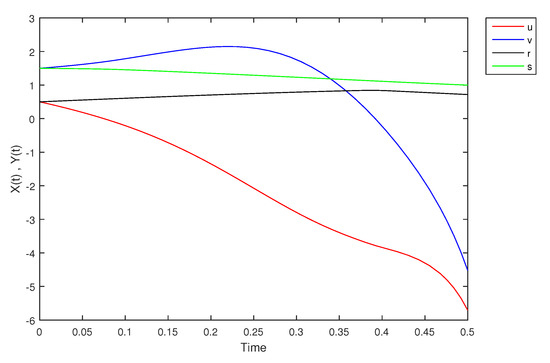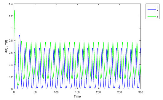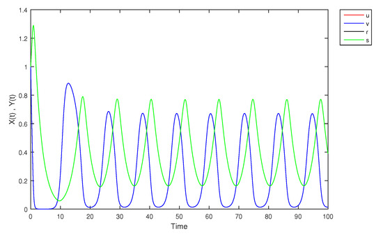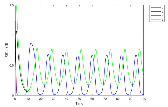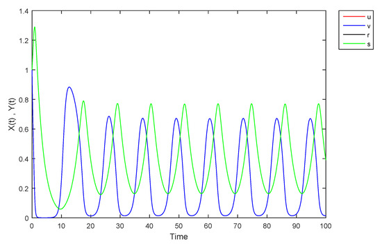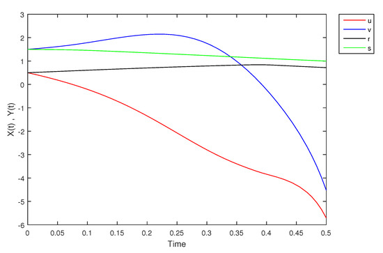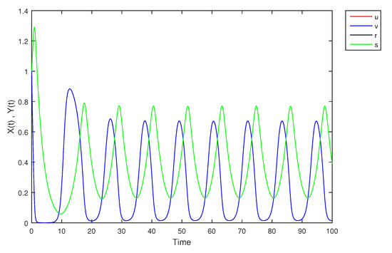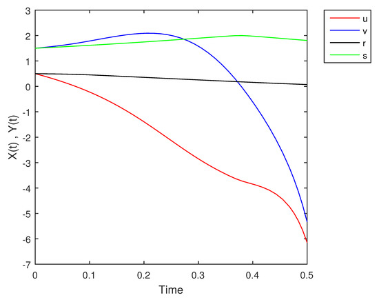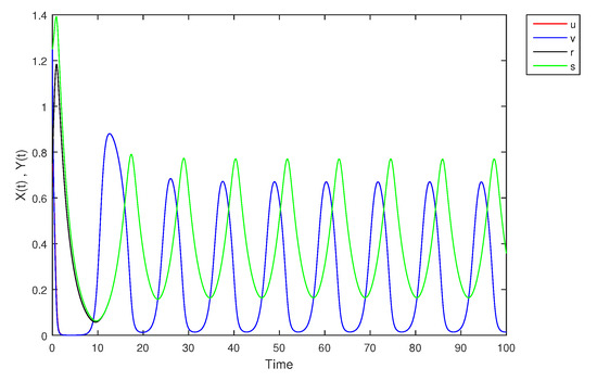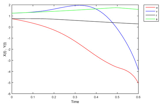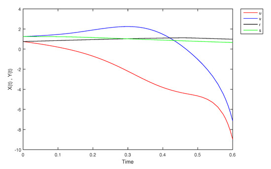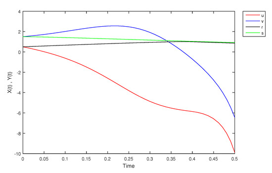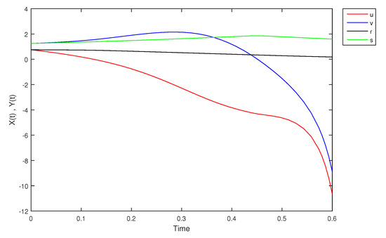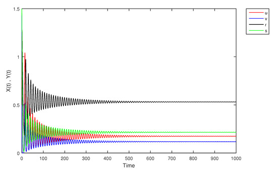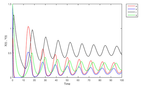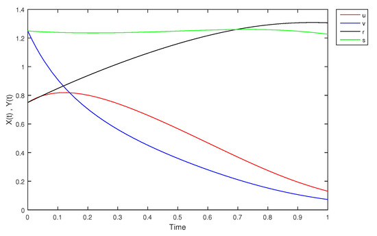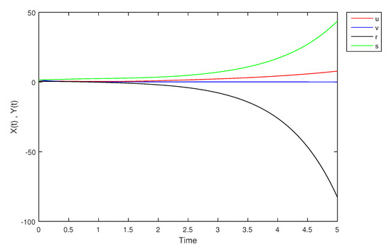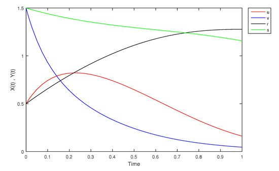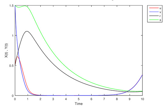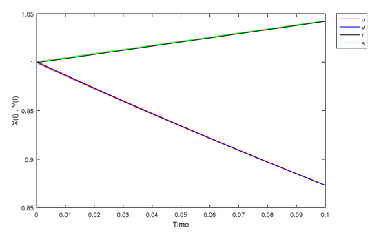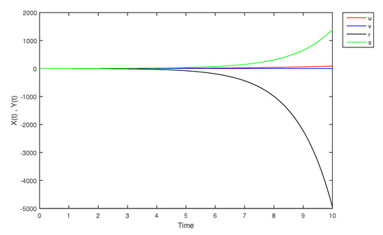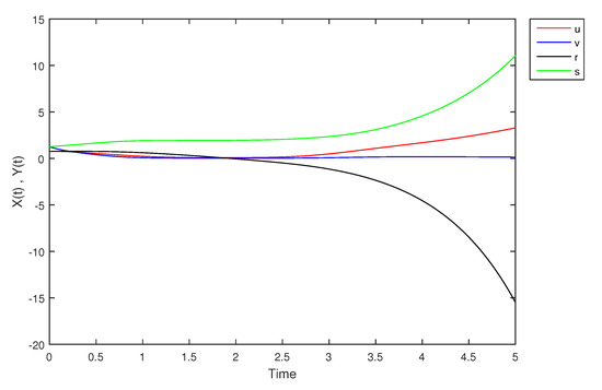 - If X and Y are (1)-differentiable, then we have the following model:The equilibrium points of (9) areAt , the solution is shown in Figure 17: