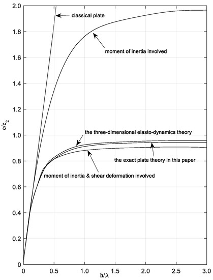 According to those dispersion equations above, Figure 1 is drawn to compare the dispersion curves; Figure 2 is drawn to compare the scattering wave numbers. From Figure 1, we can see that the dispersion curves based on the classic thin plate theory and Mindlin plate theory are far apart from the three-dimensional elasto-dynamics theory, but the dispersion curves by the exact plate theory in this paper are very close to the dispersion curves based on the three-dimensional elasto-dynamics theory. By comparing those curves, the superiority of the exact plate theory to other plate theories is obvious.