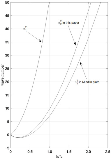 As can be seen in Figure 2, the scattering wave number obtained by the exact plate theory and Mindlin plate theory is very close, but the scattering wave number obtained by the exact plate theory is quite different from that of the Mindlin plate theory. With the increase of the vibration frequency, the scattering wave number becomes greater. It can be seen that the scattering wave number at any frequency is greater than zero, so it can be concluded that the wave mode is in the propagation region. Nevertheless, when the frequency is low, the scattering wave number is less than zero, and the wave mode is in the cutoff frequency domain, which is called a localized standing wave. When the frequency is high, the scattering wave number is greater than zero, and the wave mode is in the propagation region, which is called a propagating wave. According to Reference [7], it can be seen that the applicable frequency interval of the Mindlin plate theory is , i.e., , and the application of the Mindlin plate theory is limited. The dynamic model proposed in this paper is completely based on the three-dimensional elasto-dynamics theory, and consequently, its limitations of application are minor.