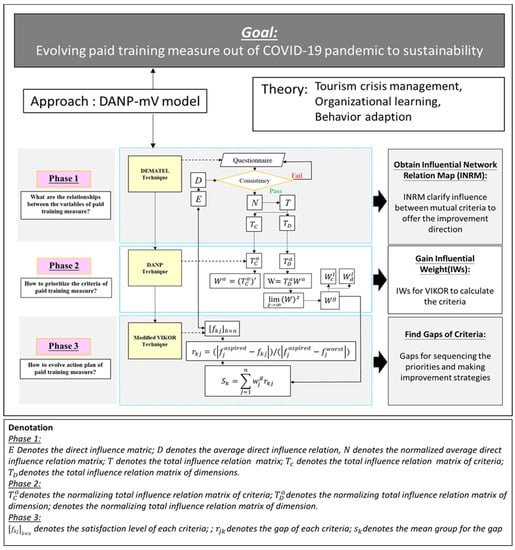 Combining the DEMATEL, the DEMATEL-based ANP, and the modified VIKOR, the innovative DANP-mV model became a well-rounded technique which is especially valuable in solving comprehensive improvement strategy problems. In this article, this approach allows for the contribution of the research purposes by (1) applying DEMATEL to explain interrelated criteria of the relationships associated with the paid training measures; (2) applying DANP to derive criteria’s influential weights; (3) applying the modified VIKOR to access the performance of the criteria; (4) being an inherently feasible solution which can report measure improvement (Figure 1).