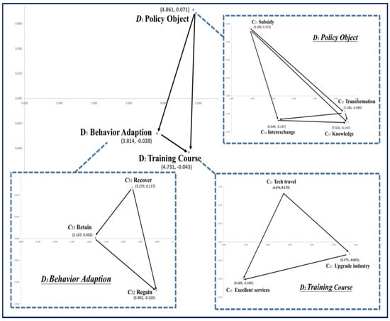 In the individual dimension, the result also demonstrates the priorities of improvement strategies. For instance, in D1-Policy object, “C11-Subsidies” emerges as the most achievable one with the smallest gap, followed by C12-knowledge. So, the achievable order can be sequenced as C11–C13–C14–C12. Similarly, in D2-Training courses, the priority can be ordered as: C23–C22–C21.