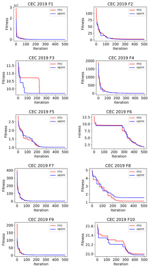 Convergence graph of the 10 CEC 2019 benchmark functions as direct comparison between HEFFF and FFO.