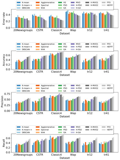 In the second simulation, the algorithm is employed for the text document clustering problem, where six standard text documents are used for evaluation purposes. The obtained results are compared to other non-metaheuristic and metaheuristic methods (K-mean, K-mean++, DBSCAN, Agglomerative, Spectral, KHA, HS, PSO, GA, MVO, H-PSO, H-GA, H-MVO1, H-MVO2). For evaluation purposes, the error rate, accuracy, precision, recall, F-measure, purity, and entropy are used in the text document clustering experiments. The proposed hybrid FFO demonstrates much better results over the other state-of-the-art methods and that it is, therefore, suitable for document clustering problems.