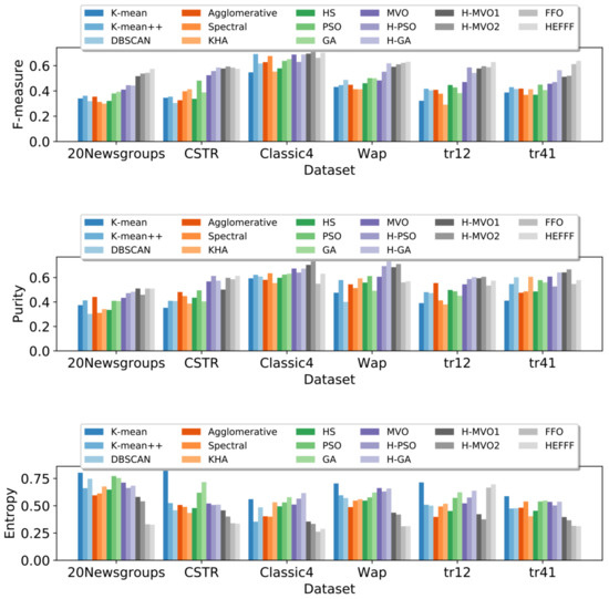 Comparison by F-measure, purity and entropy for all considered methods and text datasets.
