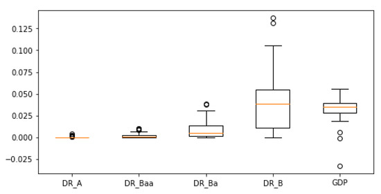 The basic information and descriptive statistics for the data are detailed in Table 1. It can be seen in Table 1 that the mean default rate of rating A is as low as 0.0004, which is equal to . Indeed, this low default scenario has caused serious PD estimation problem which has been discussed extensively in other studies such as in Pluto and Tasche [25]. Figure 1 contains the boxplot of DRs and GDP.