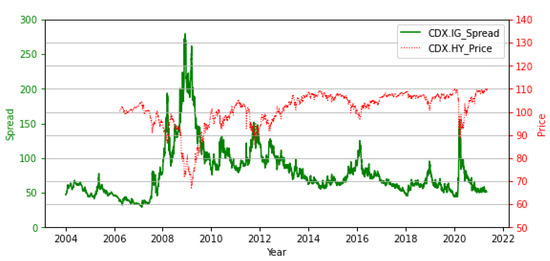 In the analysis of how determinants affect the probability of default, Ortolano and Angelini [5] contend that credit default swap (CDS) is a good indicator of banks’ creditworthiness and an efficient proxy of PD. CDX is a collection of CDS baskets that are completely standardized and exchange-traded; therefore, it is a transparent and liquid measure of synthetic credit risk. The use of liquid CDX spreads allows us to identify the direct credit market influence.
