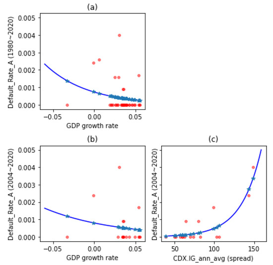 Figure 3, Figure 4, Figure 5 and Figure 6 exhibit the results of the binomial logistic regression of ratings A, Baa, Ba, and B, respectively. Correspondingly, Table 2, Table 3, Table 4 and Table 5 display the goodness-of-fit parameter estimates and p values for each rate. Starting from the probability density function in Equation (11), the maximum likelihood estimation (MLE) and the associated Akaike information criterion (AIC) were used in selecting the best fitted logistic regression model with optimal parameters for the historical DRs. The results are obtained by MLE and using the expectation-maximization algorithm [31] implemented in the “statsmodels” fitting procedure in Python. The model parameter estimates and values are listed in Table 2, Table 3, Table 4 and Table 5, corresponding to ratings A, Baa, Ba, and B, respectively. Under the null hypothesis the logistic regression model does not provide a better fit to the data than a model that contains no explanatory variable. Equivalently as the logistic regression coefficient is equal to zero, and the -value, defined as , is a measure of evidence against the null hypothesis that the coefficient is zero, or the goodness-of-fit is inadequate.