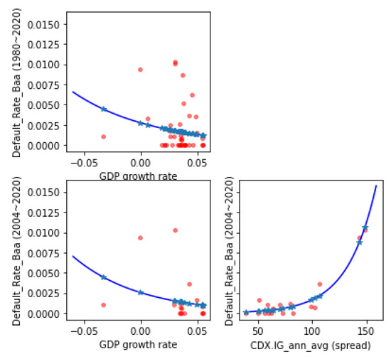 The fit results of rating A are displayed in Figure 3 and Table 2, which indicate that using 1980–2020 data (upper left with -value = 0.056) has a better fit than using 2004–2020 data does (lower left with -value = 0.254). This phenomenon may be attributable to the fact that defaults in rating A are few and the use of more years of data can reduce some bias due to data scarcity. Notably, the estimated GDP coefficient is negative (−19.436 and −12.094 for the 1980–2020 and 2004–2020 data sets, respectively) whereas that of CDX.IG (in spread) is positive (0.039). This is due to a negative relationship between DR and GDP as well as a positive relationship between DR and CDX.IG spread.