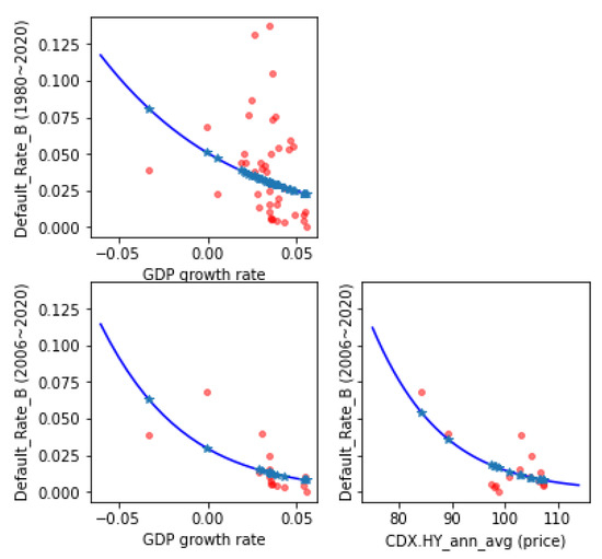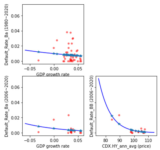 Compared with higher-rated companies, those with the B rating exhibit a special phenomenon: GDP is markedly well-fitted to DR. Figure 6 and Table 5 suggest that both GDP and CDX.HY fit DR well for rating B. All tests yield -values close to zero. Specifically, the GDP performs even better than CDX.HY when the 2006–2020 data set is used in the fit of DR. This phenomenon can be explained by the fact that the real economy (GDP, macroeconomics) is more directly connected to the defaults of lower-rated companies. When the macroeconomy declines, its influence will be more quickly linked to those companies’ DRs compared with higher-rated companies.