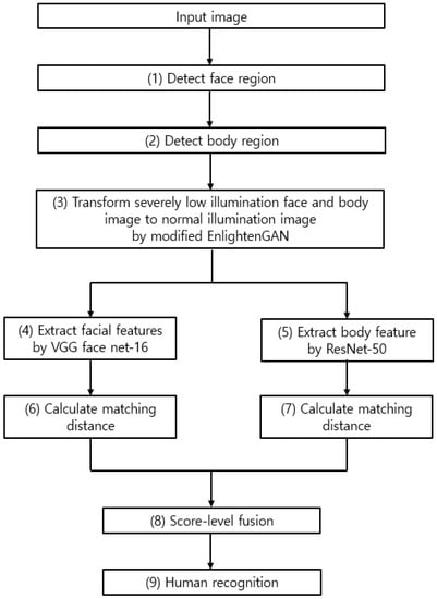 The overall structure of the proposed system is shown in Figure 1. The face region is detected in the input image acquired from an indoor environment (step (1) in Figure 1). The body region below the face region acquired in the previous step is detected (step (2) in Figure 1). In detail, the face region in the captured image is located by the adaptive boosting (AdaBoost) detector [18], and the dlib facial feature tracker [19] is applied to detect the positions of facial features (both eyes), which can more accurately define the face region. Then, the body region is anthropometrically defined based on the size and position of the detected face region. The trained modified EnlightenGAN is used to convert very low illumination in face and body regions into normal illumination (step (3) in Figure 1). Image features are obtained using a CNN model from face and body regions that have been converted to normal illumination (steps (4) and (5) in Figure 1). Imposter and authentic matching distances are measured applying the feature vectors acquired in steps (4) and (5) (steps (6) and (7) in Figure 1). Human recognition is performed (step (9) in Figure 1) using the final matching score obtained through the score-level fusion (step (8) in Figure 1) of two matching distances.