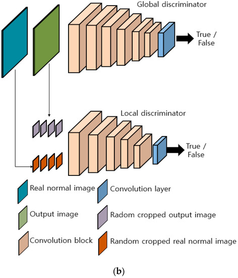 denotes the standard function, while refer to real and fake distributions, respectively. is the discriminator network, while is the sigmoid function. For the global discriminator, LSGAN was applied instead of a general sigmoid function. Equations (5) and (6) below, respectively, show the loss functions of the global discriminator and generator.