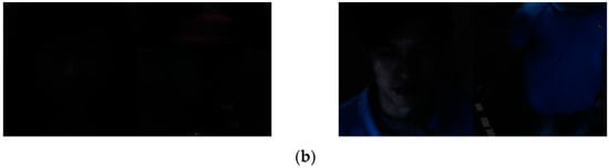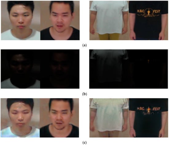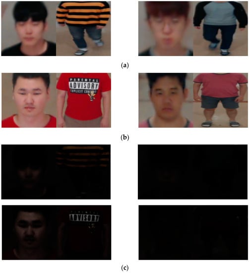 We used two categories of cameras in this research in order to obtain the Dongguk face and body database version 3 (DFB-DB3), namely, the Logitech BCC950 [32] and the Logitech C920 [33]. Figure 3 shows examples of the captured images. Figure 3a shows the images captured with the Logitech BCC950 camera, while Figure 3b shows the images captured with the Logitech C920 camera. Figure 3c shows an example of an image obtained by adjusting the gamma value of 5 only to the intensity value (V) among HSV components of the normal illumination image to convert it into a low-illumination image.
