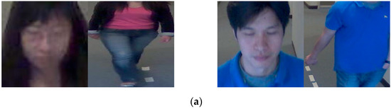 Table 5 presents the number of images of the DFB-DB3 and the ChokePoint dataset used in this study. Both datasets were assessed with two-fold cross-validation, where each dataset was further split into sub-datasets 1 and 2. For instance, if sub-dataset 2 was applied for training, sub-dataset 1 was applied for testing. If sub-dataset 1 was applied for training, sub-dataset 2 was applied for testing to estimate the recognition execution. Each sub-dataset was configured to include the images of different classes (persons). That is, the persons whose data were used for training were completely different from those whose data were used for testing. Therefore, the clothes of persons whose data were used for training were also completely different from those whose data were used for testing.