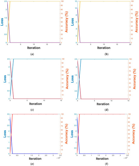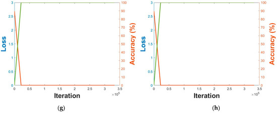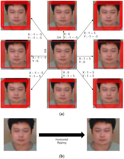 A sufficient amount of data is generally needed to train a CNN model, and data augmentation was therefore applied. With respect to Table 5, we applied data augmentation just for the data of the training, as shown in Figure 5. Image translation together with image flipping was applied for data augmentation; according to image translation, the image center was cropped and then translated in all four directions. For image flipping, the images were horizontally flipped. The training data of DFB-DB3 were translated by five pixels in all four directions, while the ChokePoint dataset was translated by two pixels in the up and down directions and by one pixel in the right and left directions. Around 440,000 images were acquired from sub-datasets 1 and 2 of the training data of DFB-DB3; around 660,000 images were acquired from sub-datasets 1 and 2 of the ChokePoint dataset. Figure 6 illustrates the CNN model accuracy–loss graph that was trained with body and face images. The training loss and accuracy graphs of all cases converged to 0 as the iterations increased, which indicates that the CNN model used in this study was sufficiently trained.