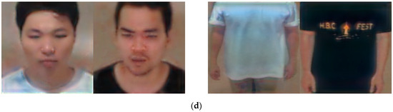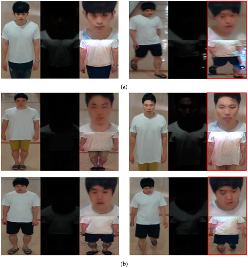 Furthermore, face and body recognition can be divided into two categories, specifically, face and body recognition based on gait, and body and face recognition based on shape and texture. According to face and body recognition based on gait, Liu et al. [6] computed the performance by applying a database acquired from other research workers, and they used Gabor feature-based elastic bunch graph matching (EBGM) and the hidden Markov model (HMM) as recognition techniques. In a study [7] on texture- and shape-based face and body recognition, the human face and body were separately recognized in an indoor environment, where the face and body were recognized with visual geometry group (VGG) face net-16 [8] and a residual network (ResNet)-50 [9], respectively.