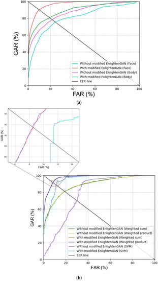 ROC curves of recognition accuracies with or without modified EnlightenGAN. Results of (a) face and body recognition, and (b) various score-level fusions.