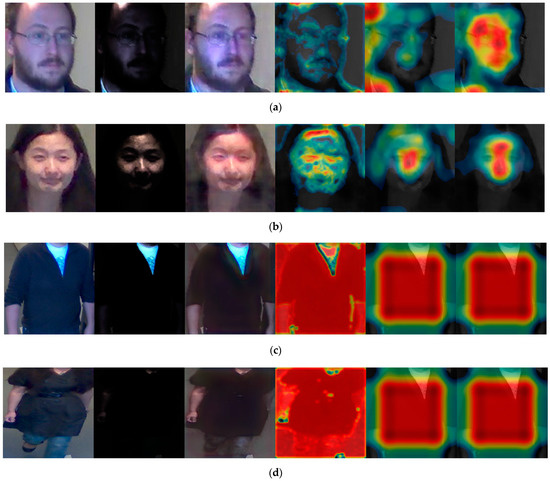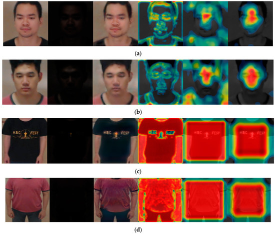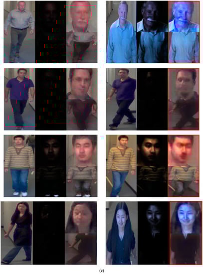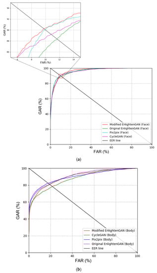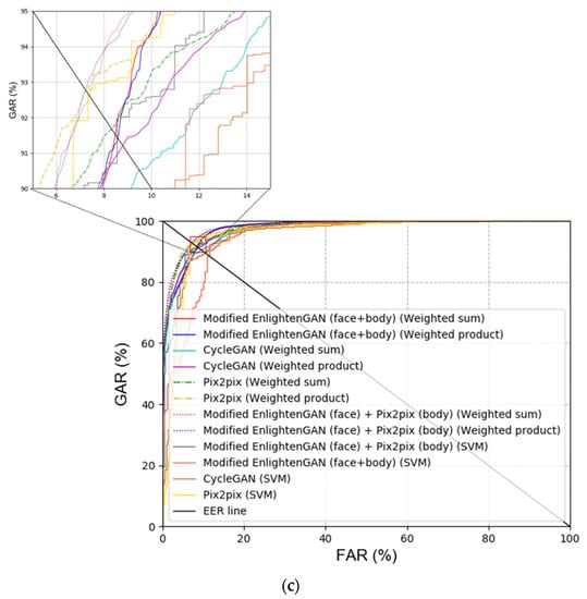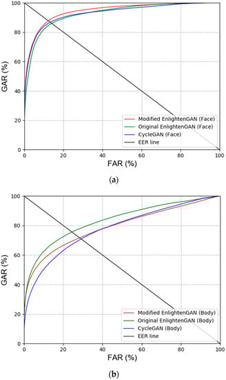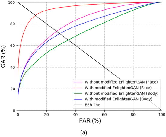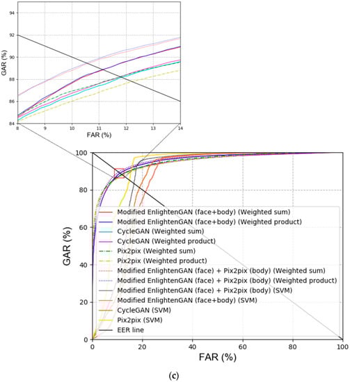 First, the modified EnlightenGAN and other GAN-based methods were compared to obtain a comparison with state-of-the-art low-illumination image enhancement methods. As shown in Table 10 and Figure 9, the modified EnlightenGAN exhibited the best performance for face images; however, the recognition performance of Pix2pix [22] was the best for body images. One of the advantages of Pix2pix is that the input image and target image are concatenated, thus exhibiting a better performance than EnlightenGAN. Owing to the nature of EnlightenGAN, an output image of an input image may not have a good quality depending on the state of the attention map. As shown in Table 10 and Figure 9, the best recognition performance was obtained when score-level fusion was applied to the results of the modified EnlightenGAN (face) + Pix2pix (body) based on the weighted product rule.