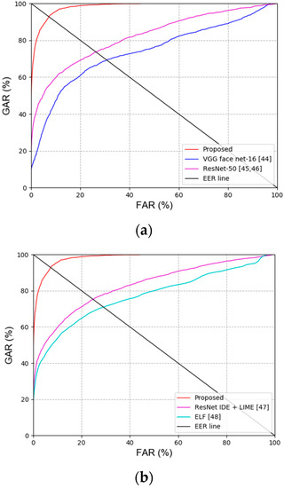 Here, and refer to the scores of VGG face net-16 and ResNet-50, respectively. In addition, refers to the weight. , , and are the trained parameters [31]. Optimal weights in Equations (10)–(13) were obtained to minimize the error (EER) of recognition in the training data. In detail, the EER of recognition was measured with training data according to various weights w, parameters, and gammas. From this procedure, the optimal weights w, parameters, and gammas were determined, which caused the minimal EER of recognition. The following method was used to determine genuine matching or imposter matching based on the final matching score obtained through score-level fusion Specifically, it is considered genuine matching if the score is lower than the threshold, or imposter matching if the score is higher than the threshold determined with respect to the EER of the genuine matching and imposter matching distribution acquired from the training data. Genuine matching refers to the case when the registered image and recognition image have the same class, while imposter matching refers to the case when the registered image and recognition image have different classes. Moreover, EER is the error rate when the false acceptance rate (FAR), which is the error rate of incorrectly accepting imposter data as genuine, becomes the same as the false rejection rate (FRR), which is the error rate of incorrectly rejecting genuine data as fake.