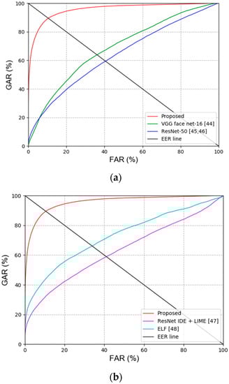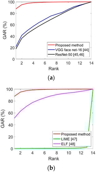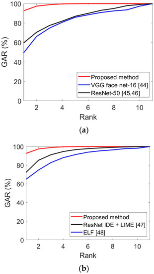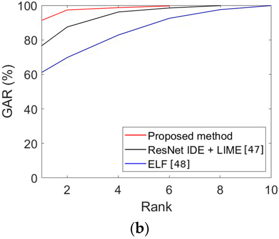 Secondly, the previous recognition methods and performances for face and face and body were compared. As shown in Table 11 and Table 12 and Figure 10, the proposed method had a more outstanding recognition performance than the state-of-the-art methods.