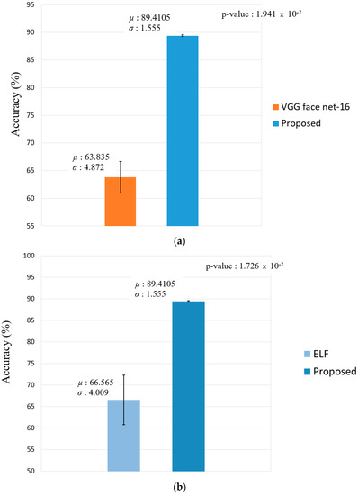 The learning rate and batch size of EnlightenGAN were 0.00001 and 1, respectively. The training epoch was 200. As an optimizer, adaptive moment estimation (Adam) was used [39]. After converting to a normal illumination image with EnlightenGAN, VGG face net-16 [8] was used for the face image, while ResNet-50 [9] was used for the body image. VGG face net-16 is a model pre-trained with the Oxford face database [40]; however, this model was fine-tuned to be suitable for the features of DFB-DB3. Moreover, ResNet-50 is a pre-trained model that was fine-tuned to be suitable for the features of body images applied in this research. We performed training by using a 0.0001 learning rate and a batch size of 20 on VGG face net-16 and a batch size of 15 on ResNet-50. Moreover, the epochs for training were 20 and 15 on VGG face net-16 and ResNet-50, respectively. As an optimizer, stochastic gradient descent (SGD) was used [39].