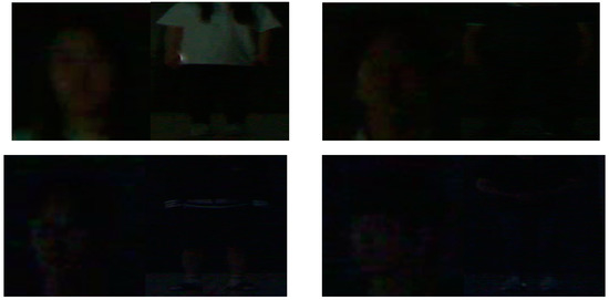 In addition, we performed the second additional experiments with an open database from Fudan University [53]. This open database includes the images captured at Fudan University in a real low-light environment, as shown in Figure 24. The total number of images is 275, and the images were captured from six people with four~six people per image. As with the experiments with the first database of real low-light environments [52], we performed two-fold cross-validation. In the first fold, 708 images of the face or body from three people were used for training, and the remaining 711 images of the face or body from the other three people were used for testing. In the second fold, 711 images of the face or body from three people were adopted for training, and the remaining 708 images of the face or body from the other three people were used for testing. As the number of training data is relatively smaller than that of the first database [52], we performed the fine-tuning of our model trained with the first database for training. From these, we determined the average value of the two testing accuracies as the final accuracy, and the final accuracies shown in Table 19 and Figure 25 confirm that our method outperforms the state-of-the-art methods. In addition, the accuracies by our method are similar to those using the simulated images of Table 12, Figure 10b and Figure 11b, which confirms that our method can be applied to low-illuminated images captured in a real environment.