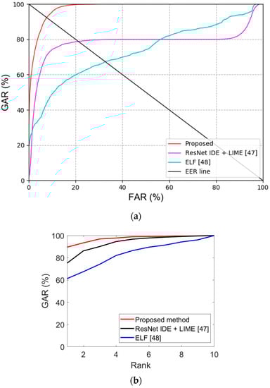 Comparisons of (a) ROC and (b) CMC curves obtained by the proposed method and state-of-the-art-methods with an open database.