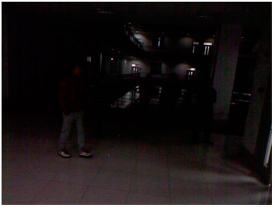 The ChokePoint dataset, which is an open database, was used in the experiment to evaluate the generality of the proposed method. The ChokePoint dataset [34] is provided free of charge by National ICT Australia Ltd. (NICTA) and is composed of Portals 1 and 2. Portal 1 consists of 25 persons (6 female and 19 male), while Portal 2 consists of 29 persons (6 female and 23 male). The ChokePoint dataset was acquired from six positions using three cameras. Portal 2 satisfied the conditions of DFB-DB3 used in this study; the data of 28 individuals (22 male and 6 female) were used for two-fold cross-validation. Similar to DFB-DB3, the gamma value of 5 was adjusted only to the intensity value (V) among HSV components to convert the image into a low-illumination image, as shown in Figure 4.