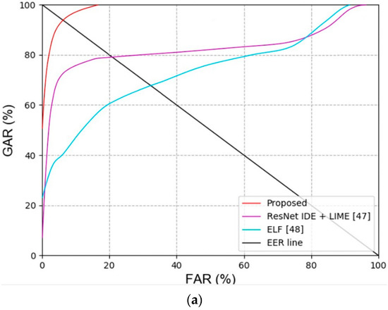 Graph for ROC curves acquired using our method and the previous GAN-based techniques. (a,b) Recognition results for face and body images, and (c) score-level fusion result.