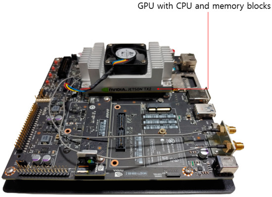 For the following experiment, the proposed method for the computational speed was compared by applying a Jetson TX2 board [54], as shown in Figure 26, and the desktop computer discussed in Section 4.1. The Jetson TX2 board is an embedded system installed with an NVIDIA Pascal™ graphics processing unit (GPU) structure with 8-GB 128-bit LPDDR4 memory, a dual-core NVIDIA Denver 2 64-Bit CPU, and 256 NVIDIA CUDA cores. The power consumption is lower than 7.5 W. The proposed method was installed with TensorFlow [55] and Keras [56] in Ubuntu 16.04 OS. The installed library and framework versions include TensorFlow 1.12 and Python 3.5; the NVIDIA CUDA® deep neural network library (CUDNN) [57] and NVIDIA CUDA® toolkit [58] are each 7.3 and 9.0.