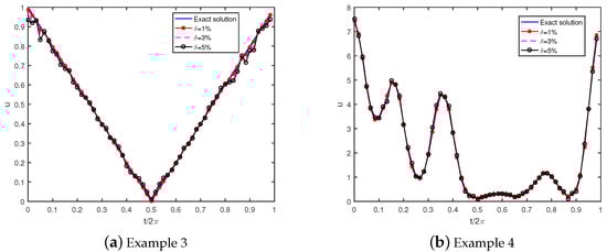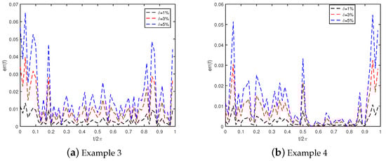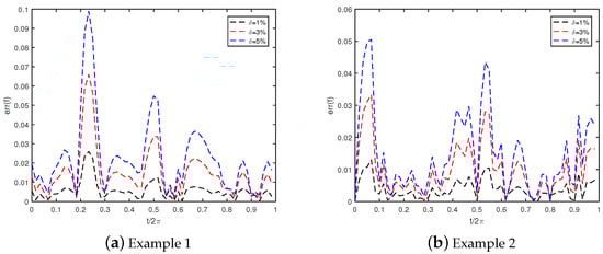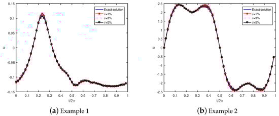 Figure 1 shows the numerical solutions with the percentages of noise for Examples 1 and 2, and Figure 2 shows the relative errors of u in each knot , , . We can observe that the numerical solutions can stably approximate and converge to the exact solution as the percentage of noise decreases.