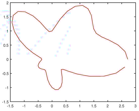 For , we can see that the kernel M has logarithmic singularities at . Therefore, in order to properly numerically deal with these factors, we divide the kernels into two parts using the method from Martensen [] and Kussmaul [].
