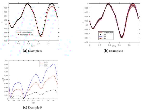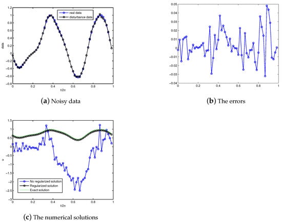 The numerical solutions for Example 5: (a) noisy data, (b) the errors for , (c) the numerical solutions.