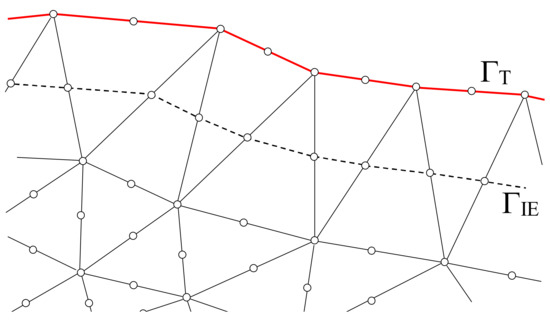 Truncation boundary ΓT and integration curve ΓIE (dashed line) in a mesh of triangular finite elements of the second order.