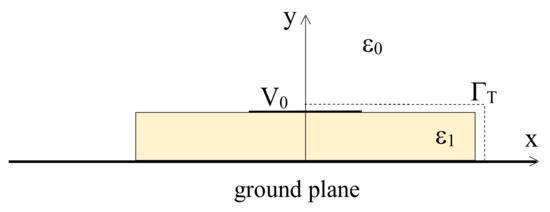 By selecting the Cartesian reference frame in Figure 7, the transmission line exhibits a double symmetry with respect to the two axes, so that the various analyses can be restricted to the first quadrant only, by imposing a homogeneous Neumann condition on the x-axis and a homogeneous Dirichlet one on the y-axis.