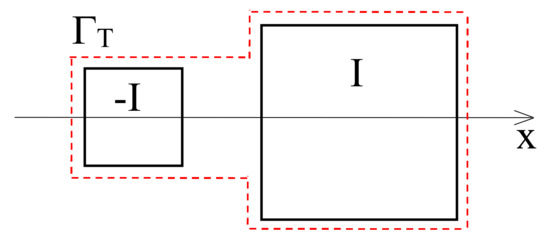 The last example concerns a non-symmetric transmission line constituted by a couple of conductors having different sections, as depicted in Figure 10. The geometrical data are: left conductor Section 1 cm × 1 cm, right conductor Section 2 cm × 2 cm, distance between their centres 2.3 cm. The conductors are made of copper (σ = 56 × 106 S/m), whereas the surrounding medium is assumed to have zero conductivity and vacuum permeability. The conductors carry two opposite time-harmonic currents I and −I of magnitude 1 A at frequency f = 1 kHz.