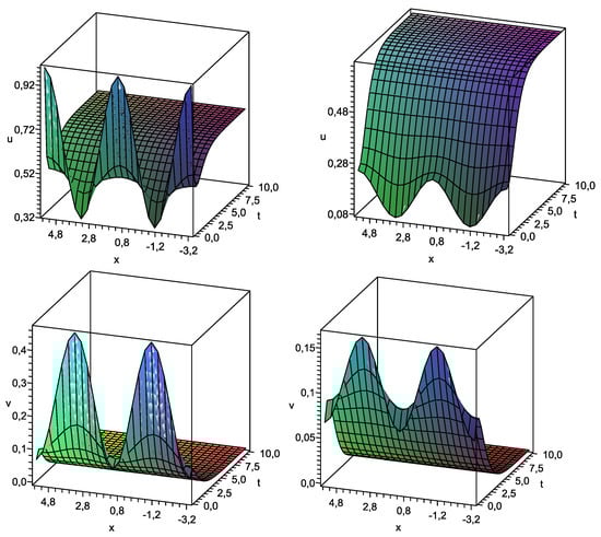 In this section, we present an example that demonstrates remarkable properties of some solutions constructed in the previous section. Obviously, using the transformation (see Formula (16)) and introducing the notation one reduces the DLV system (20) to the following form: