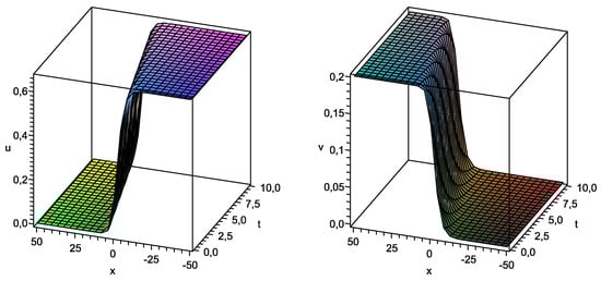 Clearly, the components u and v are bounded and nonnegative, provided that and the asymptotical behavior is the same as in (34). However, solution (36) does not satisfy the boundary condition (35) for any finite values of A and B. It can be done only for and . An example of solution (36) is presented in Figure 2.