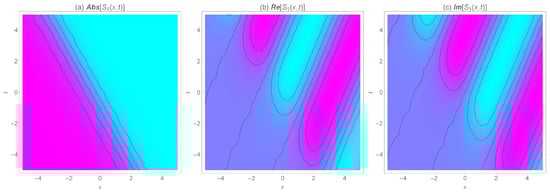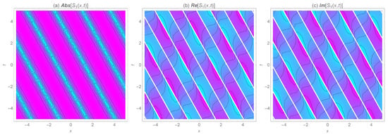 The 2D density of the wave surfaces for the absolute, real, and imaginary values of the periodic soliton solution for , ,