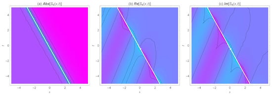 The detailed analysis of Figure 1, Figure 2, Figure 3, Figure 4, Figure 5, Figure 6, Figure 7 and Figure 8 is as follows. In the form of kink, kink-like, singular kink, periodic, and singular periodic soliton solutions, a numerical simulation of the absolute, real, and imaginary parts of some obtained solutions is depicted for special values of the parameters in Figure 1, Figure 3, Figure 5 and Figure 7. The corresponding two-dimensional density of the wave behavior is also shown in Figure 2, Figure 4, Figure 6 and Figure 8 respectively. Many other structures can be obtained by choosing free parameters. In comparison to the other applied methods [38,39,40], the gained solutions are included while applying the MSEM. One can easily conclude that the modified technique is inclusive, efficient, and direct and reduces the size of the computations. The validity of the derived solutions is guaranteed by putting them back into the original equation.